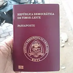 Der osttimoresische Reisepass (portugiesisch passaporte de Timor-Leste) ist der amtliche Lichtbildausweis für osttimoresische Staatsangehörige für Auslandsreisen. Der reguläre Reisepass wird von der Nationalen Direktion des Notariats (portugiesisch direção nacional de notariado) ausgestellt, das zum Justizministerium Osttimors gehört.[1] Diplomatenpässe stellen das Außenministerium und die diplomatischen Vertretungen Osttimors im Ausland aus. Dienstpässe werden vom Justizministerium, im Ausland in Verantwortung des Außenministeriums ausgestellt.[2]