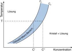 Eine Flüssigkeit oder Lösung im Ostwald-Miers-Bereich ist thermodynamisch metastabil und kristallisiert lediglich bei Hinzugabe von Impfkristallen oder weiterer Unterkühlung.