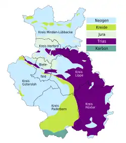 Ostwestfalen-Lippes Mittelgebirgsregionen bestehen überwiegend aus Tonmergel-, Kalk- und Sandsteinen aus dem Trias, Jura und der Kreidezeit. Der Ton ist Rohstoff zur Ziegelherstellung. Bekannteste Steinarten sind der Porta-Sandstein und der Osning-Sandstein. Diese Schichten wurden durch Erdfaltung aufgefaltet und bei der Bildung von Wiehengebirge, Teutoburger Wald und Eggegebirge in viele Sättel, Mulden, Horste und Gräben zerlegt. Die Gebirge werden als Bruchfaltengebirge beschrieben. Die einzelnen Schichten sind aus ihrer ursprünglich horizontal übereinanderliegenden Lage in eine nebeneinander oder gar in überkippter Lagerung gefaltet worden. In Ostwestfalen-Lippe beschreibt man die daraus entstehende Gebirgsform auch als Egge, die durch Dören bzw. Siepen voneinander getrennt sind. In den Beckenlagen wie Ravensberger Hügelland und Westfälische Bucht und im Wesertal wurden in der Eiszeit Lockergesteine wie Sand, Kies, Löß, Geschiebemergel abgelagert. Die mächtigsten Schichten des fruchtbaren Lößbodens aus dem Quartär finden sich vor allem in den Übergangsbereichen zur Westfälischen Bucht, zur Norddeutschen Tiefebene und in den Tälern.[3]