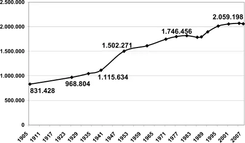 Bei den Zahlen handelt es sich bis 1970 sowie für 1987 um Volkszählungsergebnisse[7][8][9] und ab 1975 um amtliche Fortschreibungen des Statistischen Landesamtes. Die Zahlen für 1975, 1980 und 1985 sind geschätzte Werte, die Zahlen ab 1987 Fortschreibungen auf Basis der Ergebnisse der Volkszählung von 1987. Die Angaben beziehen sich auf die Wohnbevölkerung bzw. ab 1987 auf die Bevölkerung am Ort der Hauptwohnung.