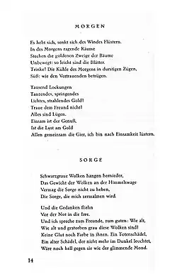 - „Ich habe zwar gedichtet und gelernt, weiß aber recht wohl: Arbeit ist das nicht zu nennen. Die Wahrheit ist, ich mache gar nichts und Nichtstun ist eine große Plage. Wie wenige halten das aus!“ (Gegen die Müßiggänger, 1918, zit. nach Gesammelte Werke, S. 59)