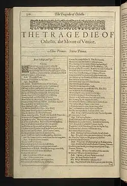 - ↑ Vgl. zu den unterschiedlichen hypothetischen Theorien über das Zustandekommen von Q und F sowie deren Beziehung und Unterschiede die ausführliche Darstellung bei E. A. J. Honigmann (Hrsg.): William Shakespeare: Othello. The Arden Shakespeare. Third Series. Bloomsbury Publishing, London 1997, ISBN 978-1-903436-45-5, S. 351–367, und Norman Sanders (Hrsg.): William Shakespeare: Othello. New Cambridge Shakespeare. Cambridge University Press, Cambridge 2003, ISBN 978-0-521-53517-5, S. 203–217. Siehe zur modernen Editionspraxis beispielsweise die Ausführungen von Stanley Wells und Gary Taylor: William Shakespeare: A Textual Companion. Oxford University Press, Oxford 1987, korrigierte Neuauflage 1997, ISBN 978-0-393-31667-4, S. 476–478, oder Ulrich Suerbaum: Der Shakespeare-Führer. Reclam, Ditzingen 2006, ISBN 3-15-017663-8, 3., rev. Auflage 2015, ISBN 978-3-15-020395-8, S. 348. Vgl. auch Sonja Fielitz: Othello. Kamp, Bochum 2004, S. 138 ff.