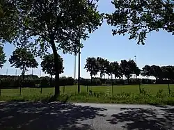 Siedlung mit Windpark Ottendorf im Hintergrund.