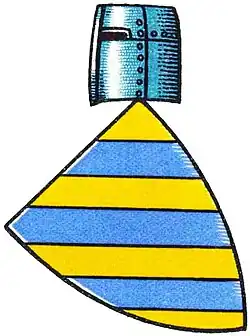Blasonierung: In Gold drei blaue schrägrechte Balken. Auf dem (gekrönten) Helm mit blau-goldenen Helmdecken ein schwarzer Hahnenfederbusch auf goldener Kugel (teilweise auch auf einem blauen Turnierhut mit goldenem Umschlag).[3]