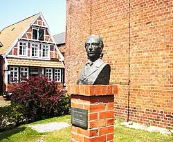 Büste von Johann Heinrich Voß des Bildhauers Frijo Müller-Belecke, im Hintergrund rechts das Johann Heinrich Voß Haus
