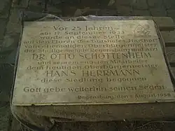 Anfang August 1959 ließ Oberbürgermeister Hans Herrmann am Gemeinschaftshaus der Siedlervereinigung in der Konradsiedlung eine Gedenktafel anbringen. Darin wird das Wirken Schottenheims (und Herrmanns) gewürdigt, ohne das NS-Regime bzw. seine völkisch-rassistische Siedlerpolitik zu thematisieren.[15] Nach dem Abbruch des Gemeinschaftshauses wurde die Tafel renoviert und ins Depot des Historischen Museums gebracht.
