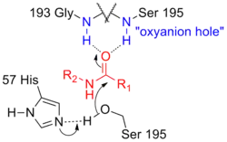 - ↑ a b R. Ménard, A. C. Storer: Oxyanion hole interactions in serine and cysteine proteases. In: Biological Chemistry Hoppe-Seyler. Band 373, Nummer 7, Juli 1992, S. 393–400, PMID 1387535.