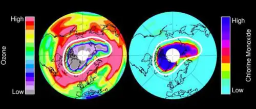 So kam es außerhalb der Antarktis wiederholt zu einem nicht erwarteten großräumigen Ozonabbau. Im Dezember 2003 wurde im Hochland von Tibet eine Abnahme des Gesamtozons um mehr als 20 % beobachtet, wahrscheinlich verursacht durch den Transport von Luftmassen mit niedrigem Ozongehalt aus den Subtropen und der unteren Troposphäre.[38] Ein ungewöhnlich starker Ozonabbau über der Arktis im Jahr 2004 wurde mit einer erhöhten Sonnenwindaktivität im Oktober 2003 in Verbindung gebracht, bei der energiereiche Elektronen und Protonen in die obere Erdatmosphäre gelangten und dort eine erhöhte Produktion von Stickoxiden verursachten. Durch starke Winde im arktischen Stratosphärenwirbel wurden die gebildeten Stickoxide weiter abwärts transportiert, wo sie ab etwa 40 Kilometern Höhe zum Ozonabbau führten.[39] Im arktischen Stratosphärenwinter 2010/2011, einem der kältesten seit Beginn der Aufzeichnungen, wurde etwa die Hälfte des arktischen Ozons abgebaut. Das Ausmaß des Ozonabbaus war so groß, dass es mit dem Ozonloch, das sich jeden Winter über der Antarktis bildet, vergleichbar war und daher als arktisches Ozonloch bezeichnet wurde.[40]
