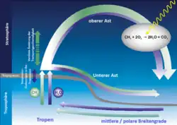 Weitere Quellgase sind Wasserdampf (H2O), Methan (CH4) und molekularer Wasserstoff (H2) aus der Troposphäre. Wasserdampf gelangt zum Teil durch den Luftmassenaustausch mit der Troposphäre in die Stratosphäre, wobei jedoch ein Großteil des Wassers an der Tropopause ausgefroren wird. Eine weitere bedeutende Quelle ist die Oxidation von Methan. Wasser wiederum ist eine Quelle für Hydroxyl-Radikale, die zum Ozonabbau beitragen, und beeinflusst den Strahlungshaushalt der Erde.[3] Methan reagiert zudem mit atomarem Chlor zu Chlorwasserstoff. Wasserstoff spielt eine ähnliche Rolle wie Methan, da seine chemischen Reaktionen die Erzeugung von stratosphärischem Wasserdampf und Aerosolen beeinflussen.[76]