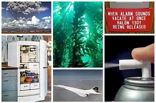 Zu den langlebigen Quellgasen gehören die halogenhaltigen Substanzen wie voll- und teilhalogenierte Fluorchlorkohlenwasserstoffe, die brom- und fluorhaltigen Halone, Tetrachlormethan, Chlor- und Brommethan. Viele dieser Substanzen sind in Europa durch die Verordnung (EG) Nr. 1005/2009 reguliert.[59] Fluorchlorkohlenwasserstoffe sind ungiftige, nicht brennbare Substanzen, die aus Kohlenstoff-, Chlor- und Fluoratomen aufgebaut sind. Technisch lassen sie sich durch Fluorierung von Chloralkanen mit wasserfreiem Fluorwasserstoff an Festbettkatalysatoren aus Aluminiumfluorid, durch die Swarts-Reaktion und weitere Methoden herstellen.[60]
