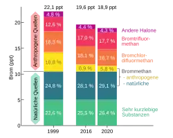 Neben den Halonen gehört Brommethan zu den bromierten langlebigen Substanzen anthropogenen und natürlichen Ursprungs. Mit einem Ozonabbaupotential von 0,6 und einer atmosphärischen Lebensdauer von 1,7 Jahren ist es als signifikant ozonabbauende Verbindung eingestuft.[72] Es ist ein Begasungsmittel, das als Insektizid zur Behandlung von Holz während des Transports oder auf landwirtschaftlichen Flächen zur Abtötung von Bodenschädlingen eingesetzt wird. Brommethan wurde 1982 in Deutschland und 2005 in den USA verboten. Im Rahmen des Montreal-Protokolls waren Entwicklungsländer verpflichtet, den Einsatz von Brommethan bis 2015 zu verbieten. Eine Ausnahme bildet Neuseeland, das die Verwendung von Brommethan erst 2033 einstellen will.[73]