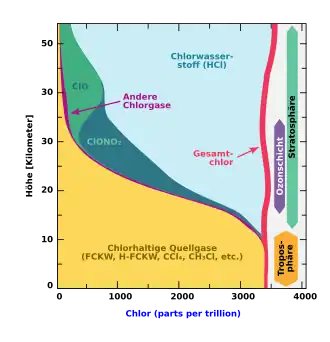 Die Konzentration chlorhaltiger Quellgase in der Troposphäre aus langlebigen Substanzen ist rückläufig und lag im Jahr 2020 bei 3,22 ppb, 12 % unter dem Höchstwert von 1993. Den größten Anteil daran hatten mit 60 % die FCKW, insbesondere Trichlorfluormethan, Dichlordifluormethan und 1,1,2-Trichlor-1,2,2-trifluorethan. Der Anteil von Tetrachlormethan und der Gruppe der teilhalogenierten Kohlenwasserstoffe betrug je 10 % und Chlormethan 17 %. Der Anteil der sehr kurzlebigen Substanzen lag bei etwa 3,5 %.[71]
