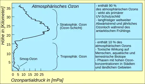 Etwa 10 % des gesamten atmosphärischen Ozons befinden sich in der Troposphäre und 90 % in der Stratosphäre, wobei der größte Teil, die Ozonschicht, sich in einer Höhe von etwa 15 bis 30 Kilometern befindet.[5] Als bodennahes Ozon ist es schädlich für den Menschen und die terrestrischen Ökosysteme, in der freien Troposphäre erhöht es die Oxidationskapazität und den Schadstoffabbau, in der oberen Troposphäre trägt es zum Treibhauseffekt bei und in der Stratosphäre absorbiert es UV-Strahlung. Neben Feinstaub gilt bodennahes Ozon als ein bedeutender Luftschadstoff, der weltweit für etwa 700.000 Todesfälle pro Jahr verantwortlich ist.[6] Ozon reizt die Schleimhäute und die Augen, beim Einatmen kommt es zu einer Reizung des Lungengewebes, was zu einem verstärkten Hustenreiz und verminderter Leistungsfähigkeit führt.[7]