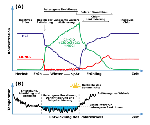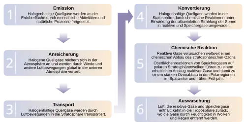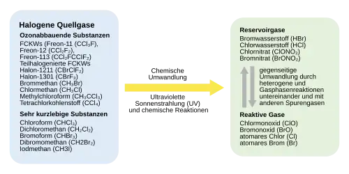 Die photolytische Spaltung von Quellgasen wie FCKW und Halonen in der oberen Stratosphäre ist für die primäre Bildung von atomaren Halogenspezies verantwortlich. Ein großer Teil der aus den Quellgasen freigesetzten atomaren Halogene reagiert jedoch schnell zu Reservoirgasen wie Chlornitrat (ClONO2) oder Chlorwasserstoff (HCl), die selbst nicht am Ozonabbau beteiligt sind. In der unteren Stratosphäre ist die Konzentration der Quellgase noch hoch, bei einer Höhe von 30 Kilometern überwiegen die Anteile der Reservoirgase. Sie entstehen bei der Reaktion zwischen reaktiven Gasen wie Chlormonoxid und Stickstoffdioxid oder atomarem Chlor und Methan. Freigesetztes Brom wird ebenfalls in Reservoirgase wie Bromwasserstoff oder Bromnitrat umgewandelt. Die Stabilität der Bromreservoirgase ist jedoch geringer und Brom ist auf atomarer Basis etwa 50-mal stärker ozonabbauend als Chlor.[82]