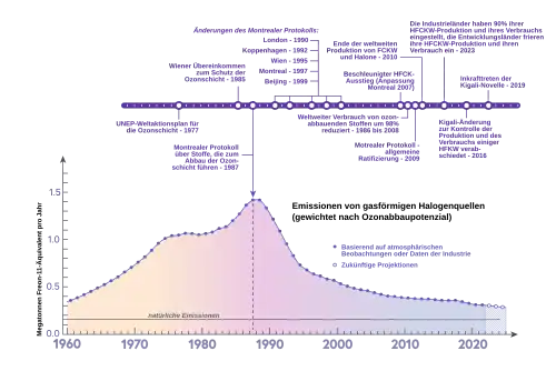 Diese Bedenken führten 1987 zur Verabschiedung des Montreal-Protokolls, eines internationalen Abkommens zum Schutz der Ozonschicht durch den schrittweisen Ausstieg aus der Produktion und Verwendung einer Reihe von ozonabbauenden Substanzen, das am 1. Januar 1989 in Kraft trat. Seither wurde es mehrfach überarbeitet. Mit der Kigali-Änderung des Montreal-Protokolls im Jahr 2016 wurde der Ausstieg aus der Produktion von Fluorkohlenwasserstoffen beschlossen, die zwar nicht ozonabbauend sind, jedoch als starke und langlebige Treibhausgase zum Klimawandel beitragen. Dank des Erfolgs des Montreal-Protokolls und seiner Änderungen und Anpassungen ist die Belastung der Erdatmosphäre mit anthropogenen Halogenen, die in den 1990er Jahren ihren Höhepunkt erreicht hatte, seither langsam zurückgegangen.