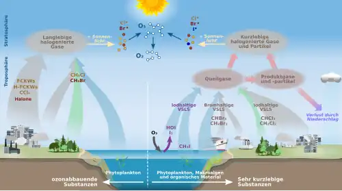 Beide Arten von Quellgasen tragen zum stratosphärischen Ozonabbau bei. Für die sehr kurzlebigen Substanzen gibt es sowohl natürliche als auch anthropogene Quellen; viele bromierte und iodierte kurzlebige Substanzen entstehen natürlich in den Ozeanen oder auf Böden, chlorierte kurzlebige Substanzen sind oft anthropogenen Ursprungs.[56] Sehr kurzlebige Substanzen, die während ihres Transports in die Stratosphäre chemischen Umwandlungen unterliegen, werden nicht als Quellgase, sondern als Produktgase bezeichnet.