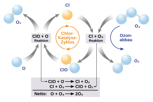 Neben dem natürlichen Abbau im Ozon-Sauerstoff-Zyklus wird Ozon katalytisch durch Radikale wie das Hydroxyl-Radikal, Stickstoffmonoxid sowie atomares Chlor, Brom und Iod abgebaut. Letztere werden photolytisch aus halogenorganischen Verbindungen wie Fluorchlorkohlenwasserstoffen (FCKW) sowie bromierten und iodierten Kohlenwasserstoffen technischen oder natürlichen Ursprungs freigesetzt. Die Nettoreaktion dieser radikalinduzierten Katalysezyklen ist die Rekombination von Sauerstoffatomen mit Ozon zu molekularem Sauerstoff.