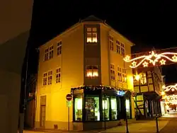 Das Fachwerkhaus entstand Ende des 18. Jahrhunderts, geht jedoch auf deutlich ältere Vorgängerbauten zurück. So ist auf der Südseite des Erdgeschosses ein massives aus dem Mittelalter stammendes Quadermauerwerk in das Gebäude einbezogen. Die Fassade des Hauses ist verputzt und im Stil des Klassizismus gestaltet. Markant ist die zur Kreuzung hin abgeschrägte Ecke des Gebäudes, die die Ecksituation betont.