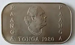 Münzen gibt es über den Nennwert von ein, zwei, fünf, zehn, zwanzig und fünfzig Seniti. Auf den drei Münzen mit dem höchsten Wert ist auf der Vorderseite wiederum der verstorbene König abgebildet, die 5-¢-Münze zeigt eine Henne mit Küken, die 2-¢-Münze das Symbol der Vereinten Nationen zur Familienplanung mit entsprechendem Schriftzug in englischer Sprache und die 1-¢-Münze Mais. Die Rückseiten zeigen jeweils Pflanzen und den Schriftzug Fakalahi meʻakai (tongaisch: „Mehr Essen“); in absteigender Reihenfolge sind abgebildet: Tomaten, Yams, Bananen, Kokosnüsse, Taro und Vanille. Eine Besonderheit stellt die zwölfeckige 50-¢-Münze dar (alle anderen Münzen sind rund).