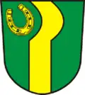 Blasonierung: „In Grün ein nach rechts geöffneter, sichelförmiger goldener Pfahl, rechts oben begleitet von einem schrägrechten goldenen Hufeisen.“[10] |