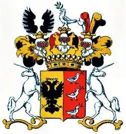 1690: Schild der Länge nach geteilt; rechts in Gold ein zweiköpfiger gekrönter, schwarzer Adler; links in Rot drei untereinander stehende, links gekehrte silberne Tauben, von welchen jede im Schnabel einen grünen Ölzweig hält. Den Schild bedeckt die Grafenkrone, auf welcher drei gekrönte Helme stehen. Der rechte Helm trägt einen offenen, schwarzen Adlersflug, der mittlere eine Taube, ganz wie in der linken Schildeshälfte, nur rechtssehend, und der linke vier Straußenfedern, silbern, rot, golden und schwarz. Die Decken des rechten Helmes des mittleren links, so wie des linken links sind schwarz und golden, die des mittleren und linken aber beiderseits rechts sind rot und golden, und den Schild halten zwei auswärtssehende, silberne Einhörner. Wie beschrieben, kommt meist diese: Wappen vor, und so findet sich dasselbe auch im Wappenbuch der Österreichischen Monarchie (XII. 3). Das Genealogische Taschenbuch der gräflichen Häuser (1848, S. 479) stellt in die rechte rote Schildeshälfte die drei silbernen Tauben (2 und 1), und in die linke goldene Schildeshälfte den zweiköpfigen, gekrönten, schwarzen Adler.[4]