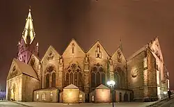 Gleichzeitig mit den Bauarbeiten in den westlichen Teilen errichtete vielleicht eine andere Bauhütte den Ostchor (über der Krypta) und das östliche Querhaus. Hier gab es wohl einen Vierungsturm, der aber 1233 einstürzte und große Teile des Ostbaus zerstörte. Nach 1231/1233 wurde der Dom von einer gotisch geschulten Bauhütte und als Hallenkirche weitergebaut. Infolgedessen wird er heute von Westen nach Osten stilistisch etwas moderner. Die östlichen Teile stammen in ihrer heutigen Form weitgehend aus der zweiten Hälfte des 13. Jahrhunderts. Um 1270/1280 entstanden die Arme des Ostquerhauses; als letztes wurde wahrscheinlich der nördliche, vieleckige Arm („Hasenkamp“) fertiggestellt.[16] Nach dem Stadtbrand von 1340 musste der Ostgiebel des Chors erneuert werden.