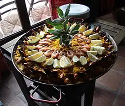 Eine Paella [] ist ein spanisches Reisgericht aus der Pfanne und gilt als das „Nationalgericht“ der Regionen Valencia. Der Begriff paella stammt aus dem Katalanischen (belegt seit circa 1892) und hat seinen Ursprung im lateinischen Wort patella, das eine Art große Platte oder flache Schüssel aus Metall bezeichnet.