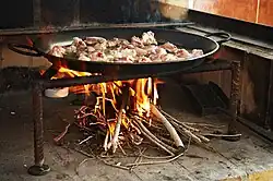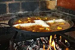 Traditionell wird die Paella auf einem offenen Pinien- oder Mandelholzfeuer im Freien zubereitet, oft in großen Mengen für die ganze Familie. Die Paella-Pfanne ruht dabei auf einem eisernen Dreifuß, dem tripote, der im Feuer steht. Diese Tradition erfreut sich in der Region Valencia großer Beliebtheit. Traditionell wird die Paella direkt aus der Pfanne mit dem Löffel gegessen; heute werden meist Teller dazu gereicht, auf die sich die Esser aus der Pfanne auftun. Normalerweise dient die Paella als Mittagessen, das gegen 15 Uhr eingenommen wird, nicht jedoch abends, da sie dafür vielen als zu üppig gilt.