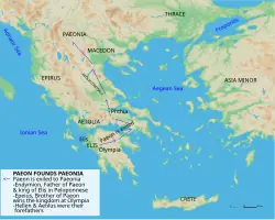 Endymion ließ unter seinen Söhnen in Olympia ein Wettrennen um die Thronfolge austragen. Epeios siegte und erbte das Königreich seines Vaters. Paion war darüber so unglücklich, dass er auswanderte und sich möglichst weit von der Heimat, jenseits des Flusses Axios niederließ. Die Landschaft wurde nach ihm Paionien genannt.[1]