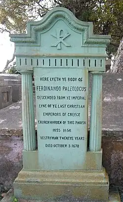 10. Die Inschrift seines Grabsteins lautet: Here Lyeth ye body of Ferdinando Paleolocus descenden from ye imperial line of ye last christian emporers of Greece, churchwarden of this parish 1655 – 1656 vestryman twentye years died October 3, 1678 (Hier liegt der Körper von Ferdinando Paleolocus, der von der kaiserlichen Linie der letzten christlichen Kaiser Griechenlands abstammt und von 1655 bis 1656 Kirchenvorsteher dieser Pfarrei war, starb am 3. Oktober 1678)