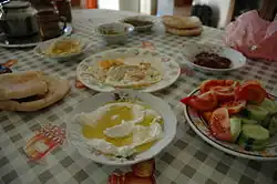 Jibneh Arabieh, auch bekannt als Jibneh baida ist ein weißer Tafelkäse, welcher mit jeglichen von den aufgeführten Gerichten serviert werden kann.[8] Der Akkawi-Käse ist eine gängige Art des Jibneh Arabieh und verfügt über eine glattere Textur und einen mild-salzigen Geschmack.[23] Er hat seinen Ursprung in der galiläischen Stadt Akkon, die dem Käse auch seinen Namen gab.