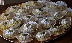 Ka'ak bi 'awja ist ein Grießmürbeteiggebäck, welches mit gemahlenen Datteln namens 'Ajwa oder Walnüssen gefüllt wird. Das Dessert ist ein für Christen traditionelles Gericht während Ostern[35], wird jedoch auch am Ende des Ramadan hergestellt, um es am Eid al-Fitr zu essen. Dies ist ein muslimischer Feiertag, welcher direkt auf den Ramadan folgt. Jedoch wird es auch während Eid al-Adha verzehrt.[26][36] Während Mawlid, dem Feiertag zu Ehren der Geburt des islamischen Propheten Mohammed, wird Zalabieh serviert. Dies sind kleine, knusprig frittierte und in Sirup gedippte Teigbälle. Der Teig besteht aus Mehl, Hefe und Wasser.[35]