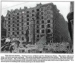 Mit seinen 800 Zimmern war das alte Palace Hotel zu seiner Zeit eines der größten Hotels der Welt. Man nannte es auch "Bonanza Inn". Finanziert wurde es vorrangig durch den Mitbegründer der Bank of California William Ralston, berühmt war es für seinen großen Hof, der um 1900 in einen Gartenhof umgewandelt wurde. Das Gebäude überstand zwar das Erdbeben von 1906, wurde aber wenige Stunden später ein Raub der Flammen.