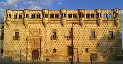 Die nach Westen gelegene Hauptfassade gilt als ein Juwel des isabellinischen Stils. Die auffälligsten Dekorationselemente sind die Diamantspitzen, die über die gesamte Fassade verteilt sind. Im obersten Stockwerk, das die Fassade bekrönt, befindet sich über einem Fries mit muqarnas-Dekor eine Galerie, die von Wachtürmchen akzentuiert wird, das Ganze mit feinstem Mudéjardekor versehen. Hinter der Galerie befand sich früher der Lesesaal der Provinzbibliothek, der mit großer Nüchternheit in einem klassizistischen Stil gehalten ist, bekrönt von einer Kassettendecke. Laut Ruiz Sousa reflektiert die Sprache der Fassade andalusische Einflüsse auf die Schule von Toledo, mit dem Ziel, ein Modell für den modus vivendi des Adels zu schaffen.[1] Egas Cueman entwarf die aufwendige skulpturale Ausstattung des Palastes.
