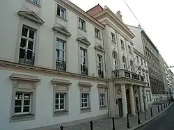 Auf der Beletage erstreckt sich am Mittelrisalit ein Balkon mit schönem Schmiedeeisengitter, der von vier toskanischen Säulen getragen wird. Das darunter situierte Korbbogenportal wird von zwei seitlichen Eingängen mit Dreiecksgiebelverdachung mit Zahnschnittfries flankiert. (Die Einfahrt zur Tiefgarage unter dem neuen Hoftrakt erfolgt nicht durch die historische Vorfahrt, von der die Feststiege in den Festsaal führt, sondern durch eine im Nachbarhaus neu angelegte Zufahrt.)