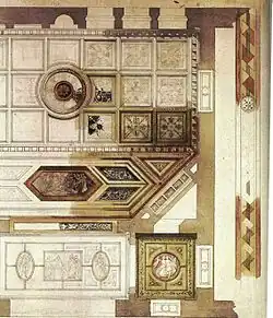 Die Blätter mit der von Semper entworfenen Innenarchitektur sind fast vollständig erhalten geblieben und zeigen eine vornehme Pracht, die aus abwechslungsreichen Kassettendecken, Bildnismedaillons, Farbabstufungen und Raumteilungen bestand, wobei das Obergeschoss reicher ausgestattet wurde, als das Erdgeschoss.[9] Zeitgenossen rühmten eine „ernste Monumentalität“, bei dem der Innenbau „in vollendsten Einklang“ mit dem einfachen Außenbau stand.[10]