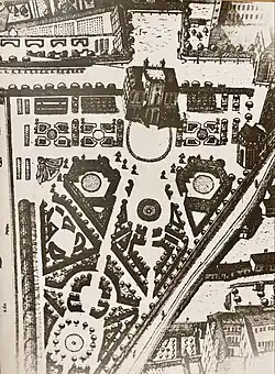 Palais Esterházy, Grundriss Erdgeschoss mit gartenseitiger Freitreppe und westseitigem Portikus, um 1850