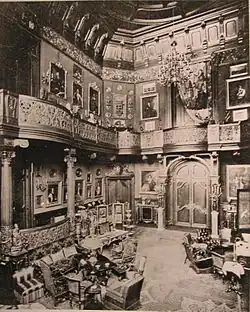 Über dem florentinischen Kamin von Francesco di Simone aus dem 15. Jahrhundert befand sich ein modernes allegorisches Fresko des Wiener Malers Ludwig Mayer. Eine antike Marmorbüste von Kaiser Augustus, eine Tonstatuette Charlotte Wolter als Thusnelda von Tilgner sowie eine italienische Marmorbüste des Niccolò Machiavelli von Cinquecento standen ebenfalls dort. Auf dem Schreibtisch links befand sich die Bronze Sappho von James Pradier, rechts die Bronzekopie Mercur nach Giambologna. Über einem altdeutschen Schrank waren die Porträts des heiligen Stanislaus Kostka als Knabe, Ende des 16. Jahrhunderts der venezianischen Schule und des heiligen Karl Borromäus zu sehen. An der Wand der abgestumpften Ecke das Gemälde St. Franciscus v. Assisi, ein Werk der spanischen Schule aus dem 17. Jahrhundert, daneben eine altitalienische Laute. Darunter auf dem Gesimse Entwurf einer Goethestatue von Rauch, darunter eine japanische Vase. Ansonsten befanden sich Kopien in Öl- und Wasserfarben nach Botticelli, Giambellino, Antonio Pollaiuolo, Andrea del Sarto, Fra Angelico, Raffael, Giorgione, Tizian, Franciabigio, Murillo und anderen. Der Plafond zeigte Porträts aus der Schule des Vittore Carpaccio.