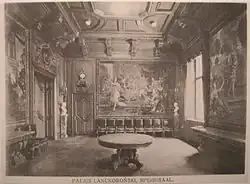 Im Speisezimmer (auch Speisesaal) hingen niederländische Tapisserien aus der Zeit Ludwigs XIV., die von der linken Wand vom Eingang zeigte eine Verherrlichung des Sonnenkönigs. Drei Marmorbüsten von Vorfahren des Grafen Anton Lanckoroński befanden sich ebenfalls in diesem Raum, eine Supraporte war von Charlemont, eine andere vom Franzosen Mouilleron.