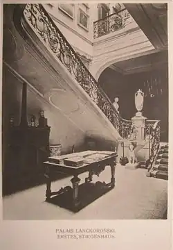 Am Ende des Treppenaufganges von der Halle zur oberen Galerie befanden sich die Gemälde Graf Kasimir Rzewuski von Andrea Appiani, daneben Graf Franz Rzewuski von Pietro Antonio Rotari, darunter Graf und Gräfin Potocki von Karl von Blaas, ein französisches Porträt von deren Töchtern aus dem Jahr 1832. Über der Tür zur Linken war die Supraporte Die Kunst von Hugo Charlemont zu sehen, außerdem waren vorhanden Makart- und Wolter-Büsten von Tilgner, das Porträt des Königs August III. von Polen in der Manier von Nattiers Porträts der königlichen Prinzessinnen von Frankreich, ein Porträt der Kaiserin Maria Theresia von Martin van Meytens, eine ideale Landschaft von Marko, des Weiteren ein holzgeschnitztes Fenster aus Kaschmir, darunter eine Vitrine mit meist modernen Glas-, Fayence- und Silbergegenständen, Interieurs von Rudolf Alt, ein Porträt des Grafen Anton Lanckoronski in jungen Jahren von Hans Makart, Romeo und Julie vom englischen Maler Benjamin West. Ferner befanden sich dort ein Glaskasten mit kostbarem Porzellan und ein modernes Bronzerelief König Stefan Bathory von Polen vom Bildhauer Antoni Madeyski. Der in Seide gestickte Fries unter der Decke, eine italienische Arbeit aus dem 16. Jahrhundert, stammte aus dem Palazzo Borghese.
