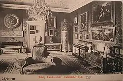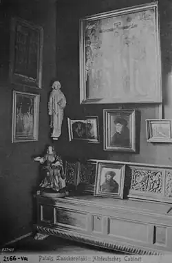 Der Eingangswand gegenüber war ein Gemälde von Madame Lafayette, ein Werk der Madame Adélaïde Labille-Guiard, ein Selbstporträt in Pastell der Vigee-Lebrun, ein kleines Porträt der Kaiserin Katharina II. von Russland in Öl, ein kleines Porträt Lavaters in Pastell, Kaiserin Maria Feodorowna von Rußland, Gemahlin Paul I. von Heinsius, sowie kleine Ölporträts der Gräfin Ludovica Lanckoronska und der Gräfin Rzewuska, geborene Gräfin Potocka.