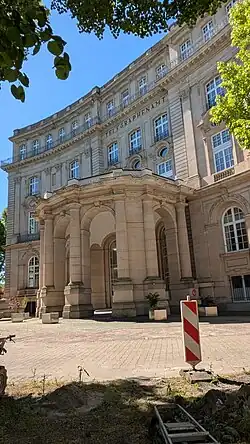 Das Gebäude wurde nach Plänen des französischen Architekten Eugène Saint-Ange (1848–1914) erbaut und weist bedeutende Parallelen zu Bauwerken vergleichbarer Größe in Paris auf. Im Zeichen der damals propagierten deutsch-französischen Erbfeindschaft wurde der Bau wegen des französischen Stils von Zeitgenossen als Ausdruck mangelnden Patriotismus kritisiert. Das viergeschossige Gebäude ist mit Stilelementen des Klassizismus ausgeschmückt, darunter der Portikus vor dem frontalen Haupteingang des Gebäudes sowie zahlreiche Gesimse und Pilaster. Das vierte Geschoss des Gebäudes befindet sich oberhalb des Kranzgesimses und ist als Mezzaningeschoss mit geringerer Höhe als die unteren Geschosse gestaltet.