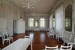 Die verbliebenen Flügelbauten der ursprünglich hufeisenförmigen Anlage sind je zweigeschossig und erstrecken sich über elf Achsen. Nach Norden hin befinden sich Anschlussbauten an den ehemaligen Mitteltrakt. Auf den dem Innenhof abgewandten Seiten schließen sich eingeschossige Gartenpavillons auf rechteckigem Grundriss mit hervortretenden Erkern an, von denen sich der östliche Pavillon weitgehend im Originalzustand mit wertvollen Stuck- und Malarbeiten befindet. Die Innenausstattung erfolgte durch den Kurmainzer Hofstuckateur Johann Peter Jäger und dem Maler Christian Georg Schütz d. Ä. Bemerkenswert sind der Spiegelsaal sowie die Bibliothek, das sogenannte „Köpfezimmer“, mit Medaillons griechischer und römischer Weiser. Die Zimmer und Flure zeichnen sich durch hochwertige Stuckarbeiten und Malereien sowie zahlreiche Marmorkamine aus.