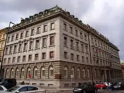 Nur wenige Schritte vom Wenzelsplatz entfernt, entstand an der Ecke der Straßen Bredovská (heute Politických vězňů) und Washingtonova (heute Opletalova), gegenüber dem Deutschen Theater (heute Staatsoper Prag), zwischen 1923 und 1925 das Palais Petschek als Unternehmenssitz der Petschek-Bank.[11] Das monumentale fünfgeschossige Bauwerk sollte die Stabilität der Bank, ihr Kapital und ihre Macht demonstrieren. Der Bau, bei dem zum ersten Mal in Prag Fahrzeugkräne zum Einsatz kamen, wurde bis zum Jahr 1929 verschiedentlich erweitert und kostete über 150 Millionen Kronen. Das neoklassizistische Gebäude entstand aus Stahlbeton nach den Entwürfen des Architekten Max Spielmann. Die Fassade erhielt im unteren Teil eine Granit- und im oberen eine Travertinverkleidung.[12]