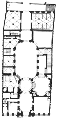 Der Grundriss spiegelt den zeremoniellen Übergang vom öffentlichen Raum in die repräsentativen und schließlich privaten Bereiche. Der standesgemäßen Einfahrt folgte erhebendes Hinaufschreiten: „Das erste Vestibül mit seiner eleganten, ionischen Pilasterordnung, ein sich anschließender und gegen den Hof mit zwei Säulen öffnender Rundraum bilden die Durchfahrt. Man wendet sich zur Rechten in ein weiteres Vestibül von quadratischer Grundform, mit konkav abgestumpften Ecken, um zu der stattlichen, einarmigen Treppe zu gelangen, die den rechten Hofflügel füllt. Im Hauptgeschoß ist vorn eine Flucht von vier Räumen angeordnet, an die sich über dem zweiten Vestibül ein Vorzimmer mit geschickt angelegten Nebentreppen, dann der runde Speisesaal und im linken Hofflügel die größeren Festräume anschließen.“[4]