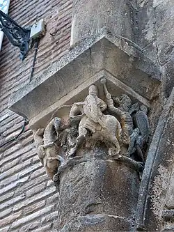- Auf der linken Seite stellen stilisierte Figuren eine Episode aus dem Rolandslied dar, den Kampf des fränkischen Ritters Roland gegen den Riesen Ferragut – eine Allegorie auf den Kampf des Guten gegen das Böse.[8] Auch mit der Wahl dieses Themas zeigt sich der Bezug der Anlage zum fränkischen Kulturkreis.[9] Besonders selten in dieser Zeit ist, dass der Künstler, Martin von Logroño, die Arbeit signiert hat.[Anm. 2][10]