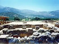 Der Palast ist, wie die anderen minoischen Palastanlagen auch, um einen großen Zentralhof von 48 × 23 Metern errichtet, zu dem neben einem Prozessionsweg im Westen, vorbei an acht gigantischen Getreidesilos, verwinkelte, vergleichsweise schmale Korridore aus 4 Richtungen, aufwändig gepflasterte Treppen und Räume führen. In der Mitte des Hofes liegt ein Brandopferaltar: Vier Ziegelsteinpfeiler umgeben eine Grube, in der Asche gefunden wurde, die tierische Brandopfer belegt. Die Pfeiler dürften einst Roste gehalten haben, auf die das Brandopfer gelegt wurde. An der Westseite befinden sich eine Vielzahl kleiner Räume sowie zwei monumentale Treppenanlagen, die belegen, dass die Palastanlage mindestens zwei Stockwerke hatte. Hier befanden sich auch ausgedehnte Lagerräume und Schreine.