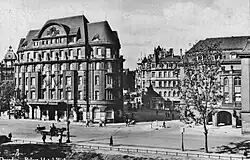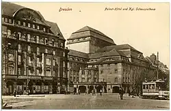 Das fünf- bis sechsgeschossige Gebäude wurde 1911 aus dem früheren „Turmhaus“ und seinen Nebengebäuden zu einem repräsentativen Gebäude im Monumentalstil der Reformarchitektur mit barocken Anklängen umgebaut. Architekten waren William Lossow und Max Hans Kühne, die auf dem Nachbargrundstück zur gleichen Zeit das Gebäude des Schauspielhauses Dresden errichteten: Es war gleichsam dessen architektonisches Pendant.