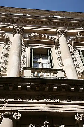 Die zweigeteilten Fassade besteht aus übereinandergestellten Halbsäulen ionischer und korinthischer Ordnung. Im Mezzaningeschoss befinden sich in nur sechs Fensterachsen Reliefs, da der Palast im sechzehnten Jahrhundert um zwei Fensterachsen nach links erweitert wurde.