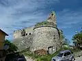 Ursprünglich hatte die Burg einen rechteckigen Grundriss mit zwei Haupttürmen, die angeschrägte Mauern hatten und in der südwestlichen und der südöstlichen Ecken platziert waren, der erste mit rundem Grundriss, den man heute noch in Teilen sieht, mit einem Durchmesser von 7,5 Metern, der andere mit quadratischem Grundriss mit runder Basis. Auf der Nordseite lag ein Walldamm, der mit der Zerstörung durch die Nazis vollständig zusammengebrochen ist und heute die Radio- und Fernsehantennen des Dorfes trägt; das Rondell besteht aus einer Mauer in Form eines Kegelstumpfes, wogegen sie im Nordosten aus einem zylindrischen Körper besteht. Die Ansichten der Ost- und Westseite sind mit den originalen, geschlossenen Mauerkörpern der Kurtine befestigt, die die Festung auf dem Erdrutschhügel erhöhten und eine Art doppelte Mauerverteidigung für die Angreifer darstellte.